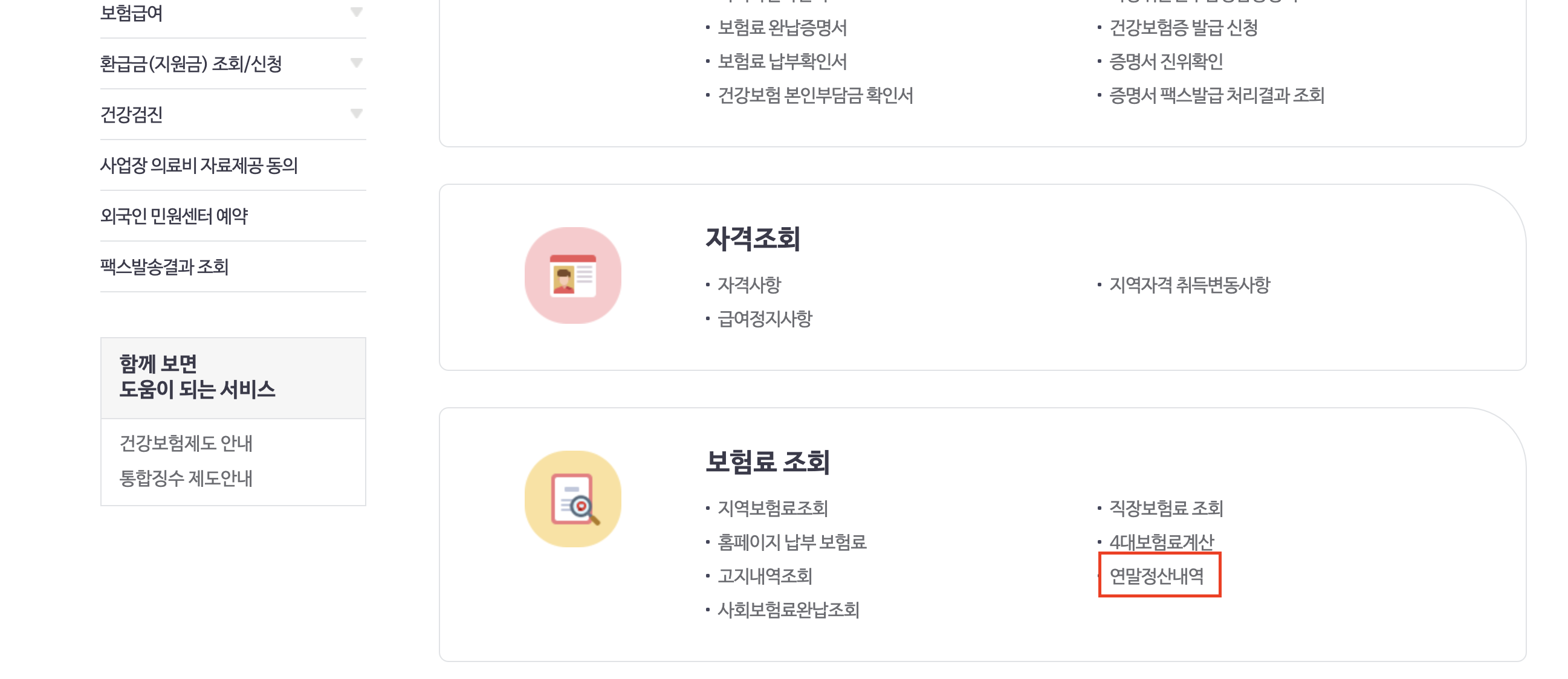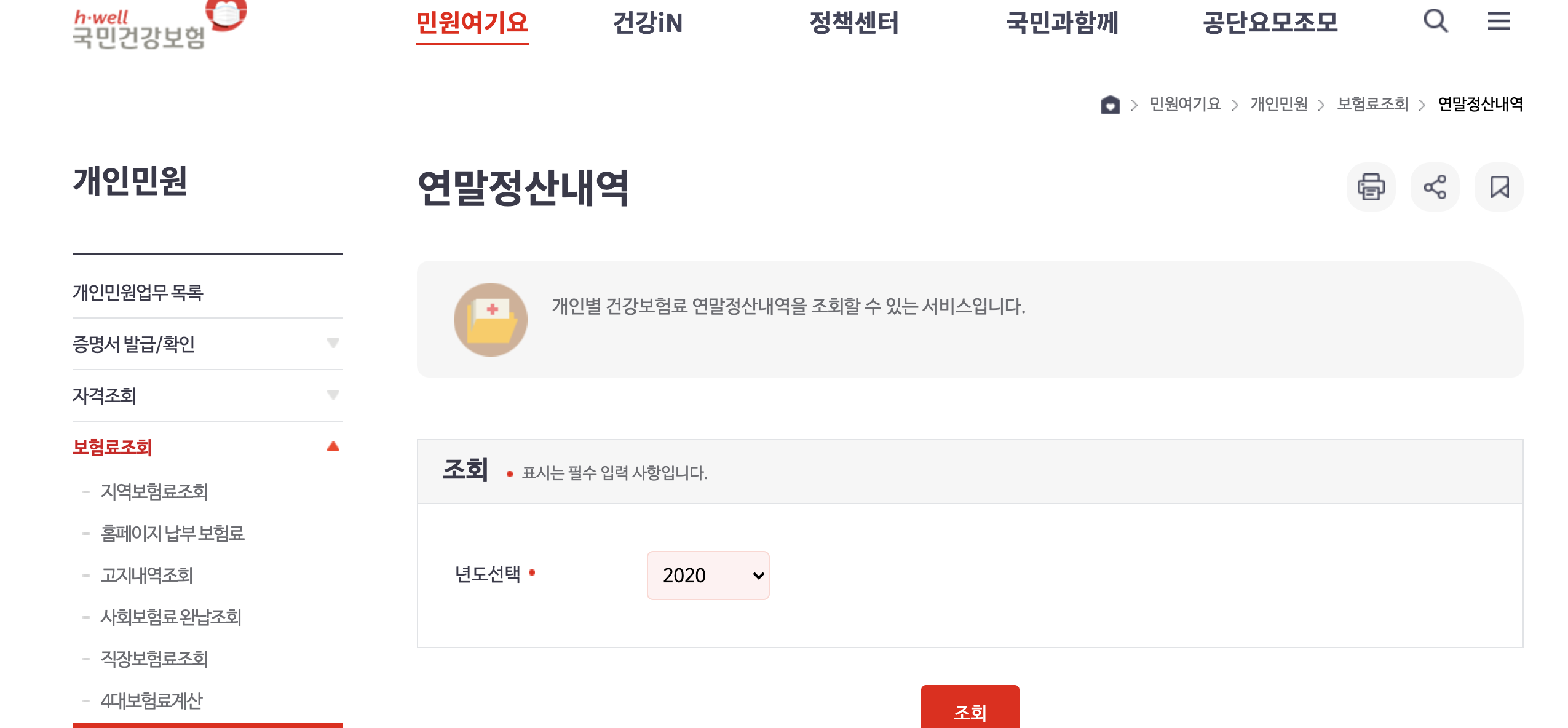 국민건강보험 홈페이지 > 상단 민원여기요 > 개인민원 > 보험료 조회 > 연말정산 내역