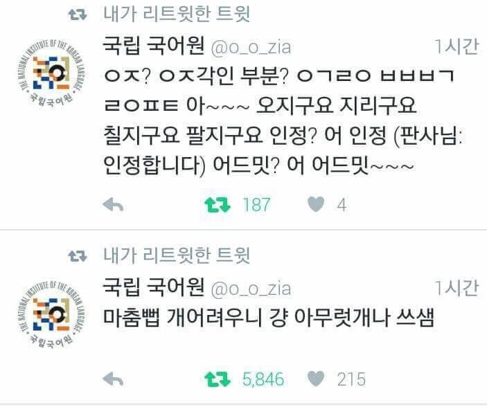 다만 이 계정은 국립국어원 공식 계정이 아닙니다. 하지만 트위터의 많은 계정이 국립국어원 계정을 따라한 뒤 국어를 파괴하는 장난을 쳐 몇 년이 지난 아직도 레전드로 불리고 있습니다.