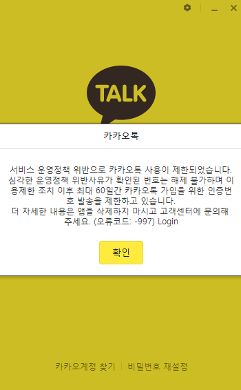 서비스 운영정책 위반으로 카카오톡 사용이 제한되었습니다. 심각한 운영정책 위반사유가 확인된 번호는 해제 불가하며 이용제한 조치 이후 최대 60일간 카카오톡 가입을 위한 인증번호를 제한하고 있습니다. 오류코드-997
