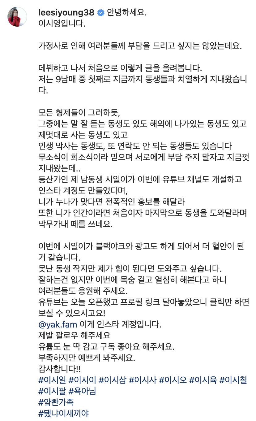 이시영이 인스타그램을 통해 가정사와 동생 공개를 암시하는 듯한 글을 올려 주목을 받고 있습니다.